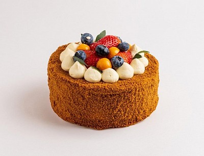 Медовые коржи на основе гречишного меда, сметанно-сливочный крем, башенки из взбитого ганаша, медовая крошка, ягоды, физалис. 1,1 кг